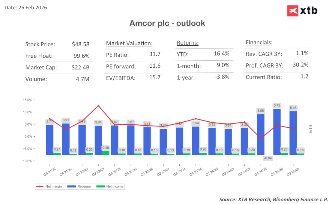 Amcor (AMCR) to zdecydowanie mniej ekscytująca spółka niż Arista, zajmująca się czymś dużo bardziej przyziemnym. To globalny producent opakowań, przeróżnych opakowań – folii, kartonów, buteleczek itp., choć dominuję te pierwsze z gatunku „opakowań elastycznych”. Spółka jest typowym „defensive play”, płacącym solidną dywidendę, z dobrze zdywersyfikowaną działalnością zarówno produktowo (jw.), jak i geograficznie (48% przychodów to USA). Patrząc na wyniki można odnotować skok przychodów, ale wynika on przede wszystkim z przejęcia Berry Global, co ma pozwolić przekierować ofertę w ku wyżej marżowym produktom.